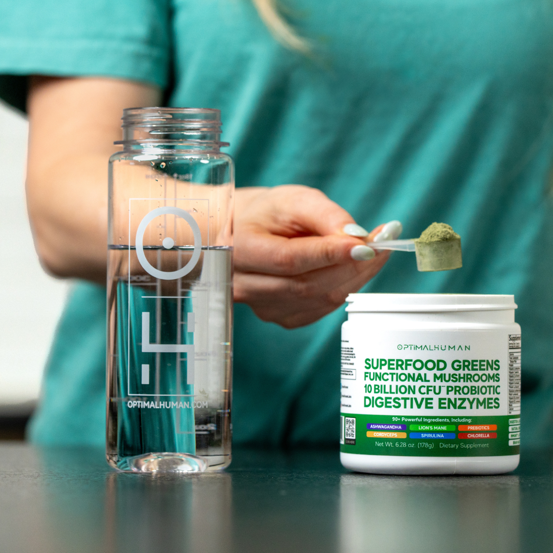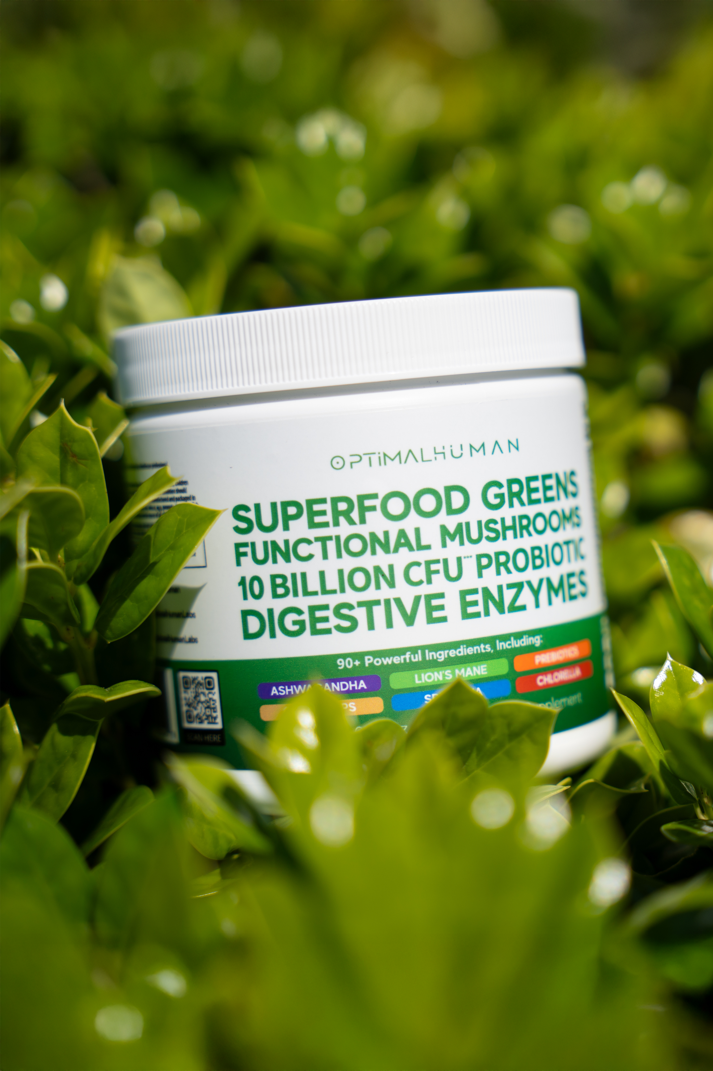 At the core of Optimal Human is the Nutrient-Rich Superfood Blend, featuring Spirulina, Chlorella, and Wheatgrass. These nutrient-dense superfoods provide antioxidants that help fight free radicals* and support cellular health*. This blend works synergistically with the Gut Health & Digestive Support Blend, which includes probiotics, enzymes, and prebiotics to improve digestion* and enhance nutrient absorption*.
